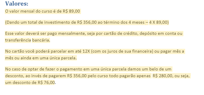 O cronograma do curso, com os preços podem ser visualizados clicando no link abaixo: